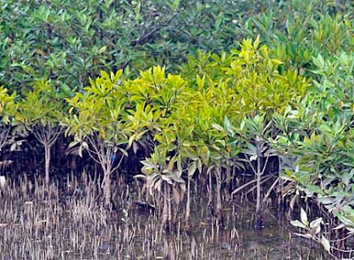 The mangroves formed a kind of island, with tall trees in the middle and ringed with shorter trees and tough clusters of some sort of grass-like plants.