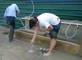 Siong Kiat takes us to the high-pressure hose where we can get clean enough to face civilisation.