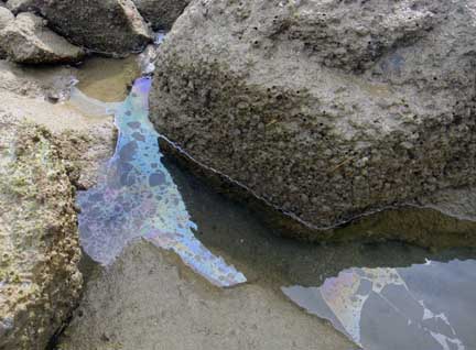There is still sheen on some parts of the shore, but not as much as on my trip in December. Perhaps the rain today dispersed it?