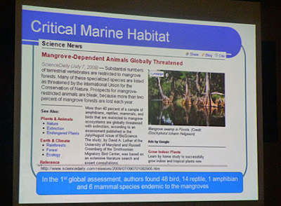 Shufen gave a very thorough talk discussing tricky issues such as: what is a mangrove? The tree or the ecosystem? She explains that we should use 'mangrove forest' when referring to the ecosystem to avoid confusion. She also discusses: what is a 'true mangrove'? She outlines some of the key characteristics, based on Tomlinson. It appears this is still an ongoing issue and the status of many plants are still being discussed.