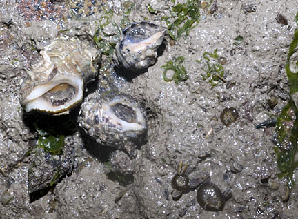 Some parts of the shore near the big rocks were super soft, coated in a thick layer of Nest mussels (Musculista senhousia). Many tiny anemones were embedded in the 'nest' created by the mussels. While several kinds of Drills (Family Muricidae) were roaming the nests, probably eating the mussels.