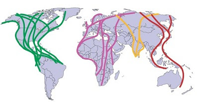 This map shows in different colours the main routes that birds use on the annual migrations. From the World Migratory Bird Day website |